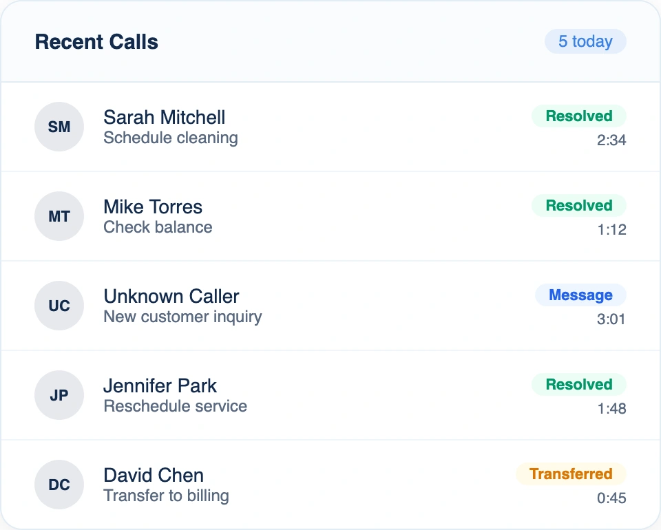 The AI agent looks up every caller by phone number and pulls their full profile — name, properties, upcoming services, and balance. It can schedule new services, answer account questions, and transfer to your team when needed.