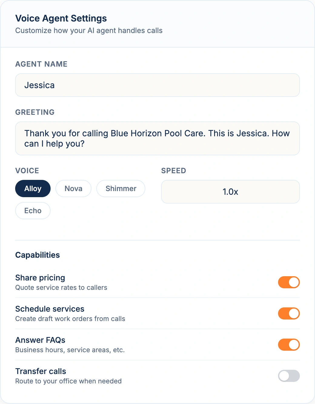 Choose from six distinct voices, add custom greetings, configure business hours, and set capabilities — so every call sounds on-brand.